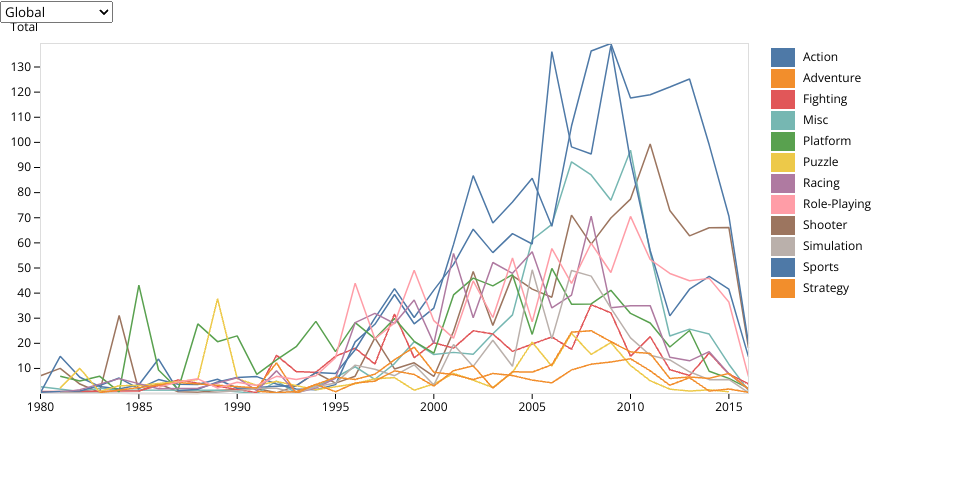 Sales of video games released by genre over time.