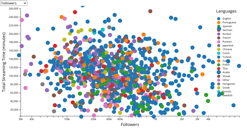 A scatter plot of the Twitch Dataset with no axes. It shows the total followers with respect to the total stream time for English, Portuguese, Spanish and Korean streamers.