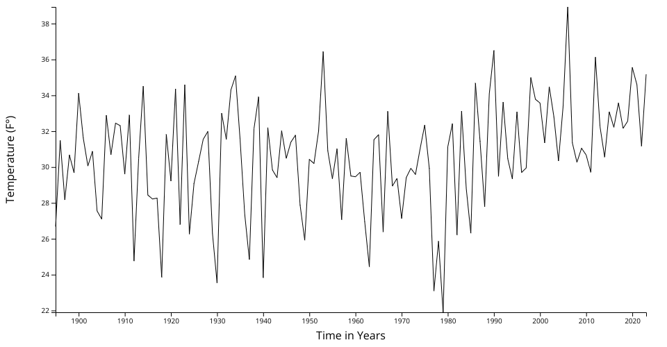 A line chart of the Climate Dataset. It gives climate at glance in US for the month of January from year 1895 to 2023.