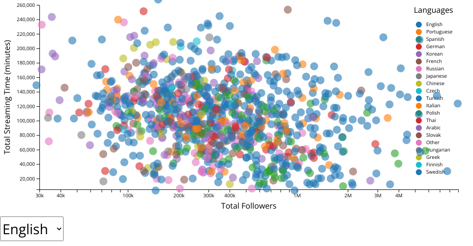 A scatter plot of the Twitch Dataset with no axes. It shows the total followers with respect to the total stream time for English, Portuguese, Spanish and Korean streamers.