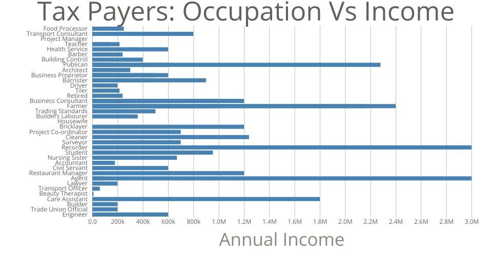 This bar chart shows the occupation of Tax Payers against their annual income.