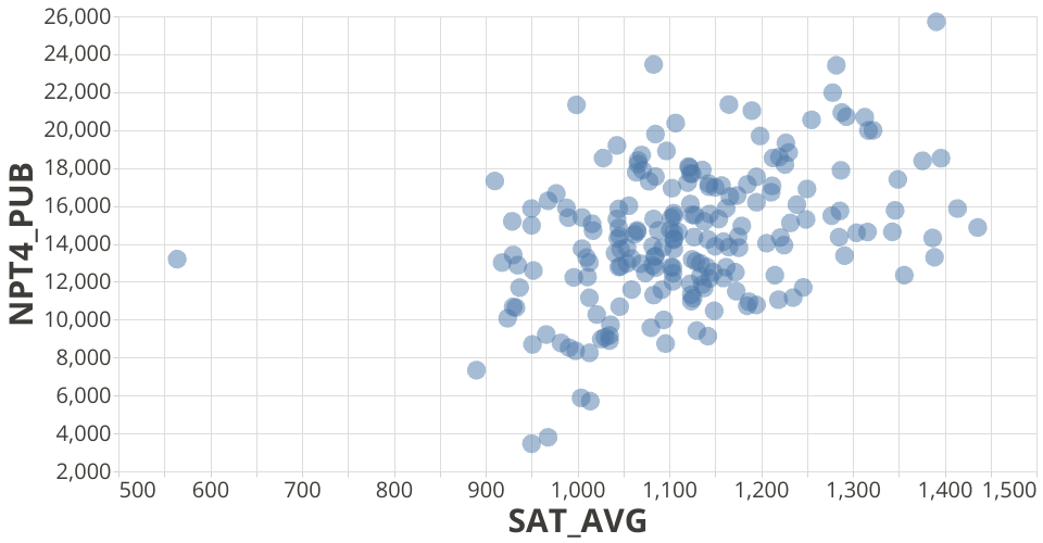A visualization constructed using the vega-lite-api.This visualization uses College Scorecard Data to show the relationship between the price of public institutions and average SAT scores. The dataset comes from the College Scorecard Select Variables dataset.