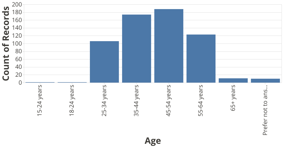 A visualization constructed using the vega-lite-api. The visualization shows the breakdown of NACRO membership by age. The data come from the NACRO Member Survey dataset.