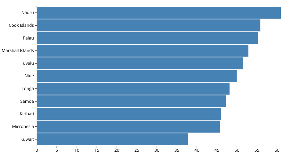 This bar chart shows the obesity rates of the top 4 most obese countries in the world. The data comes from the year 2016 [https://en.wikipedia.org/wiki/List_of_countries_by_obesity_rate]