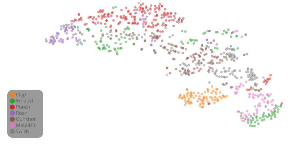 目前已实现的功能: 1、通过点击圆播放每一个声音,拖过按下键盘上的Q键,可暂停播放声音 2、选择图例强调某类声音 3、放大缩小以及左右拖动画面 4、鼠标悬浮在某个声音上,会显示其名字 5、遇到重叠的圆,可以通过鼠标拖拽圆,若需圆恢复原位,再次长按圆即可恢复