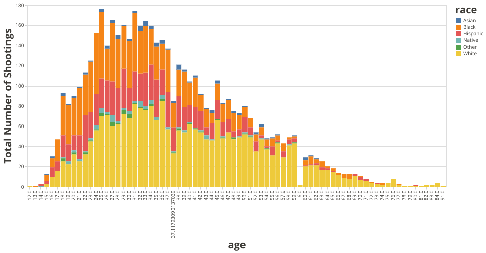 This bar chart visualization shows the total number of shooting distribution along with different age.