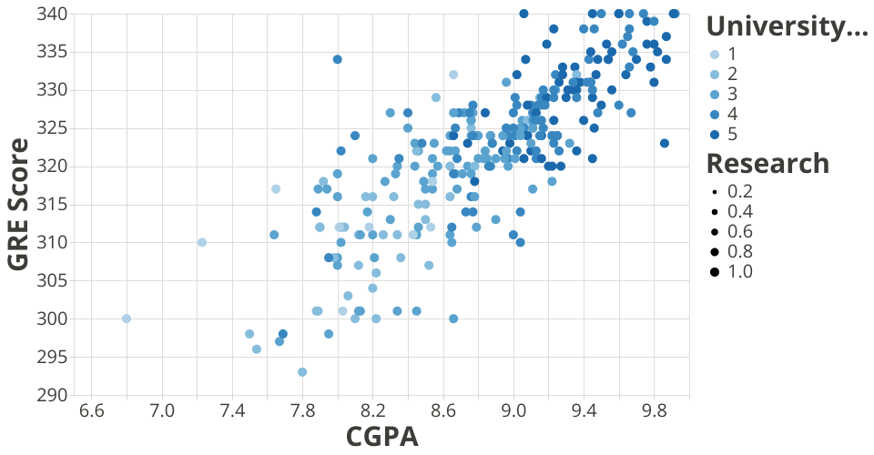 This bar chart visualization shows the University rank, research score distribution along with the GRE Score and CGPA.