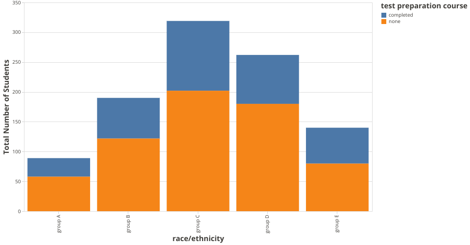 This bar chart visualization shows the test preparation course (completed/not) distribution along with different race/ethnicity.