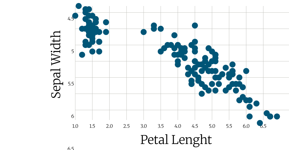 A scatter plot of [Iris] https://gist.githubusercontent.com/curran/a08a1080b88344b0c8a7/raw/0e7a9b0a5d22642a06d3d5b9bcbad9890c8ee534/iris.csv