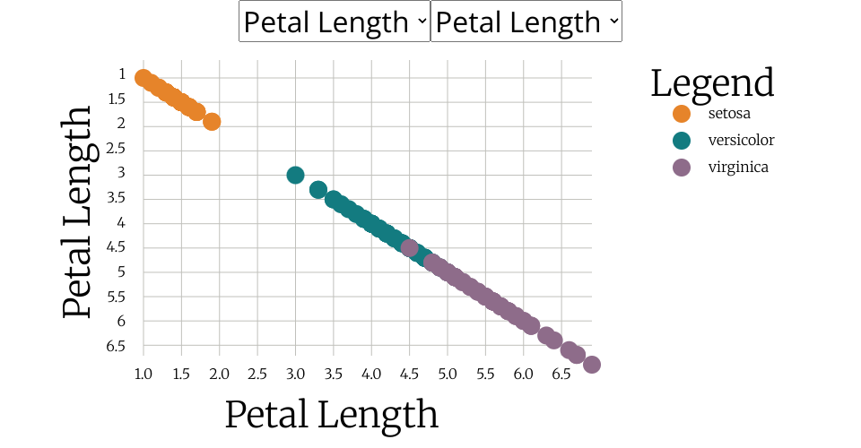 A scatter plot of [Iris] https://gist.githubusercontent.com/curran/a08a1080b88344b0c8a7/raw/0e7a9b0a5d22642a06d3d5b9bcbad9890c8ee534/iris.csv