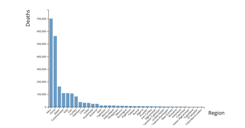 A bar plot shows the deaths of earthquakes in different countries of 19 Century. Iterated from last week's visualization.