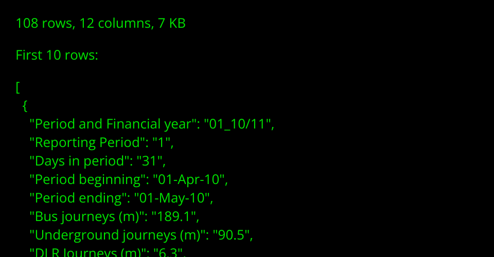 More information about the data (from the website): Number of journeys on the public transport network by TFL reporting period, by type of transport. Data is broken down by bus, underground, DLR, tram, Overground and cable car.