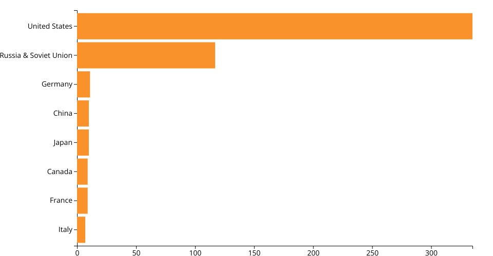 This bar chart shows the number of space travellers (astronauts, but sometimes civilians too!) per country. The eight countries represented here are the countries with the highest number of space travellers in the World. The data is from World Atlas.