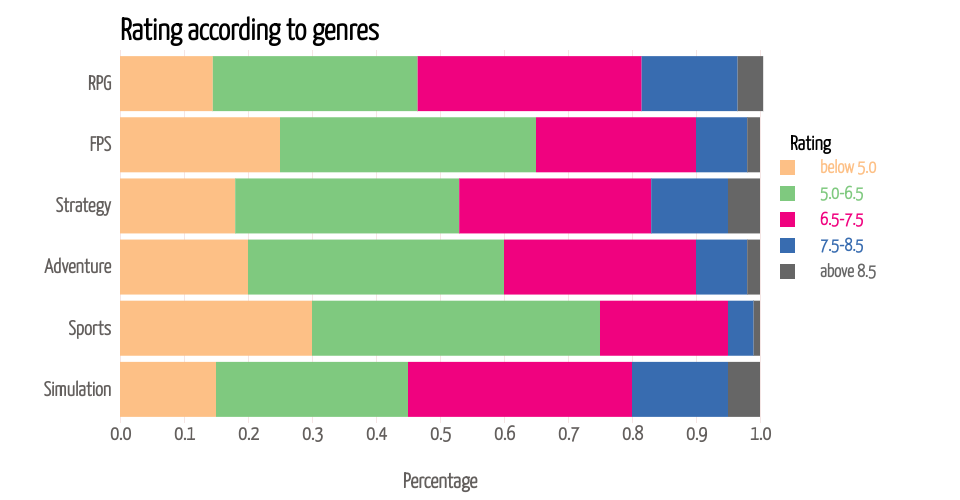 This stacked bar chart gives the percentage of each rating level within different movie genres. The aim is to show the impact of genre on movie ratings. When the mouse hovers over each bar, you can see pop-ups of accurate percentage of each rating level within each genre. Total percentage is 1, representing 100%.