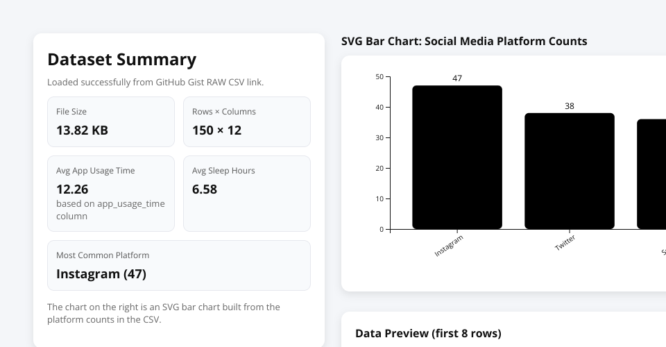 *-File size (KB) *-Rows × Columns *-Average app usage time *-Average sleep hours *-Most common social media platform ✔ SVG bar chart showing platform distribution ✔ Scrollable preview table (first 8 rows)