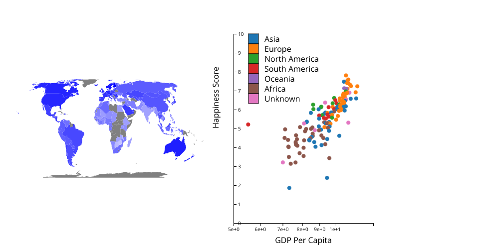 The scatter plot is linked to the map so you can see where each dot is located in the world. The scatter plot shows the positive correlation between happiness and GDP (something that the map can't show). It is color coded by happiness score.