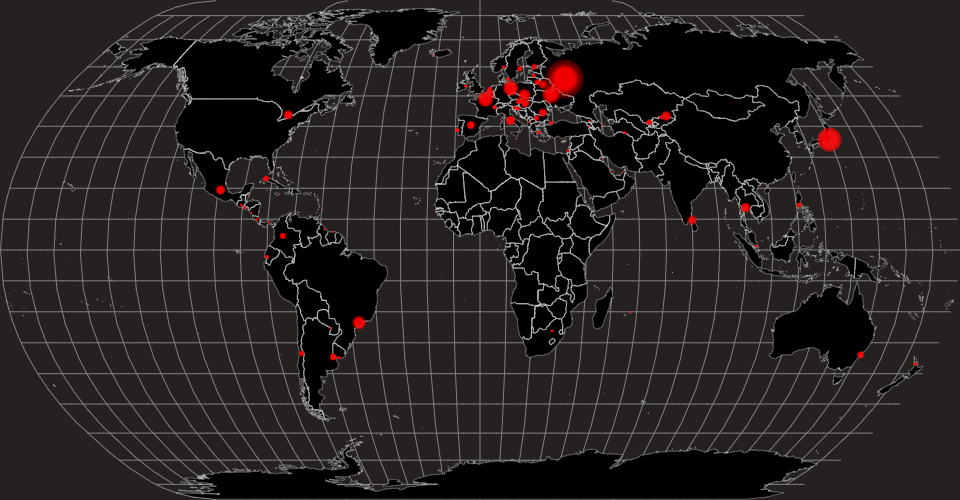 A world map showing cities with population greater than 50,000. City data from Simplemaps: World Cities Database.