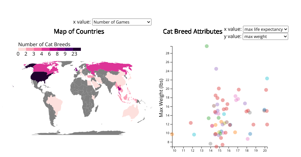 On the left is a world map with countries colored based on the number of cat breeds. This world map is zoomable and pannable using pinches and drags. On the right is a scatterplot of cat breeds graphed based on their max life expectancy and max weight.