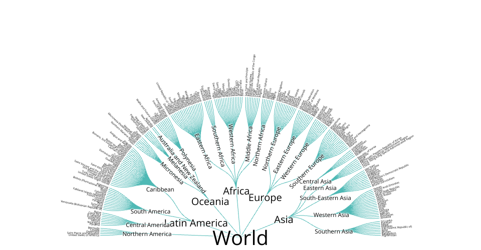Radial Tree Visualization of Countries Hierarchy. Has Panning and Zooming interaction.