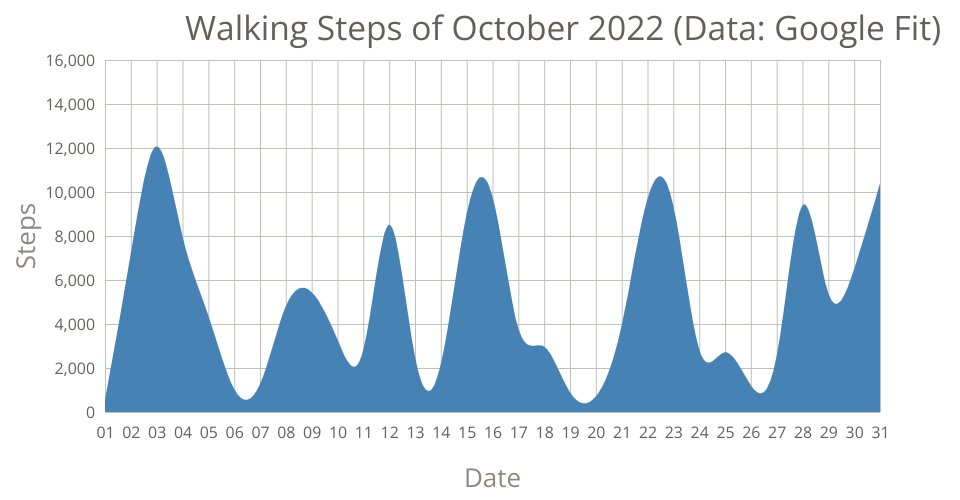 This area chart shows walking steps of a person during october 2022. Data from Google Fit App