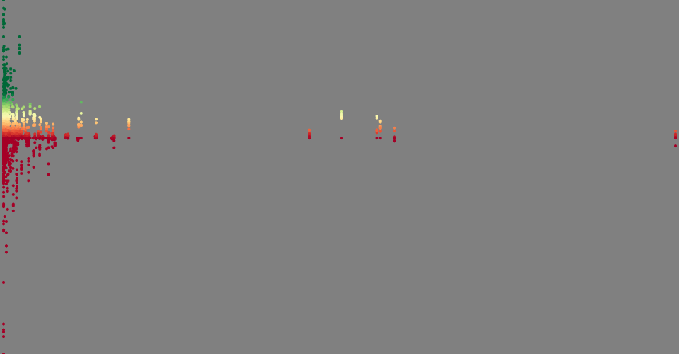 First pass visualization which includes the total area per country on the x-axis and percentage change in tree cover on the y-axis, to visualize the change in global tree cover since 2000. This includes color mapping is a redundant channel demonstrating the percentage change in tree cover.