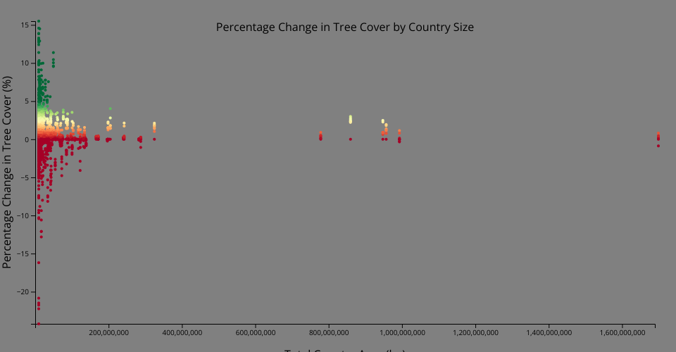 Scatterplot visualization which includes the total area per country on the x-axis and percentage change in tree cover on the y-axis, to visualize the change in global tree cover since 2000. This includes color mapping as a redundant channel demonstrating the percentage change in tree cover.