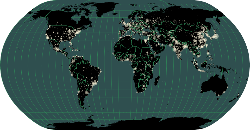A world map showing cities with population greater than 50,000. City data from Simplemaps: World Cities Database.