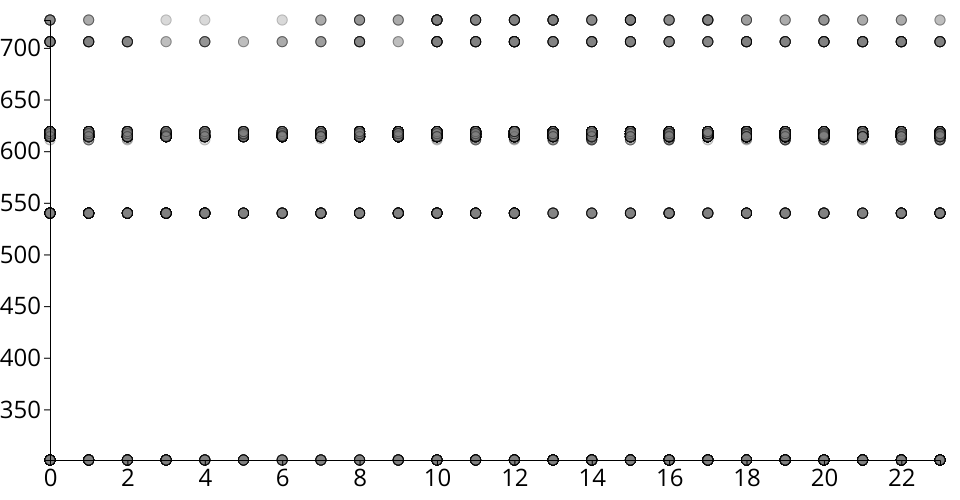 Scatterplot of hour versus offense code for Boston crime data, specifically for theft-type crimes.