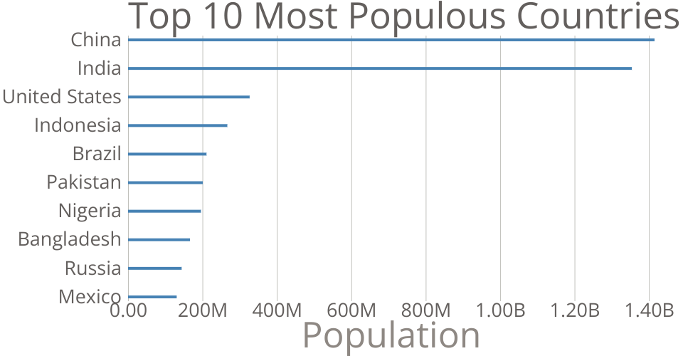 This bar chart shows population of the top 10 most populous countries. The data comes from the year 2018 estimate in United Nations: World Population Prospects 2017. It also demonstrates customization of D3 axes.