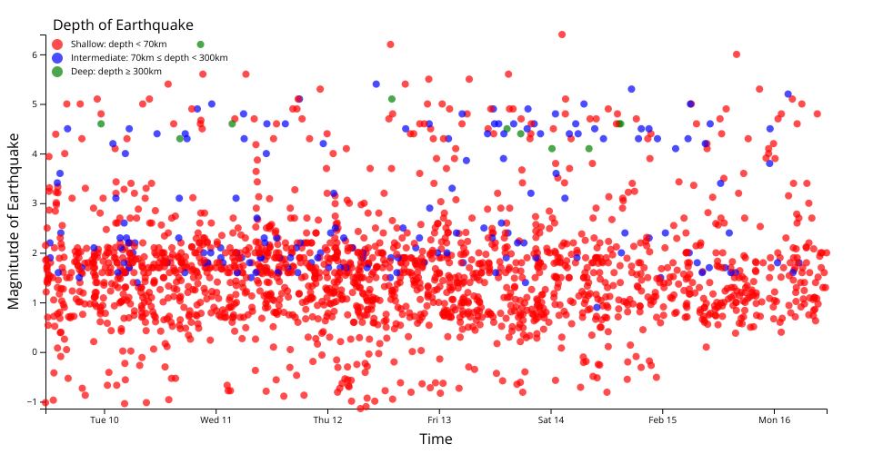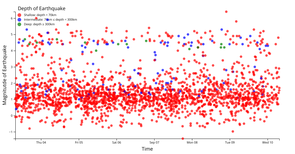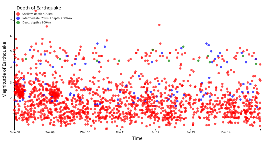 This scatter plot demonstates the relationship in between the depth and the magnitude of the earthquakes. All the circles are categorized into three colors. Each color represents a depth range: shallow, imtermediate, and deep.