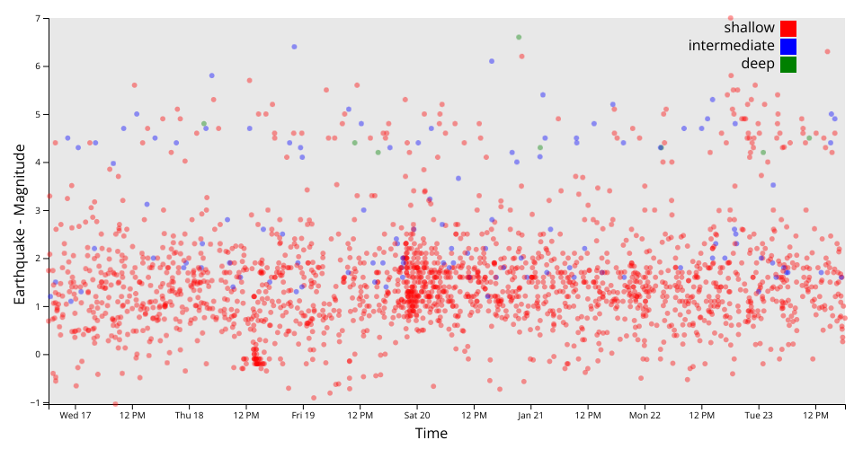 A scatter plot shows both magnitude and depth of the earthquakes happened in the past 7 days.