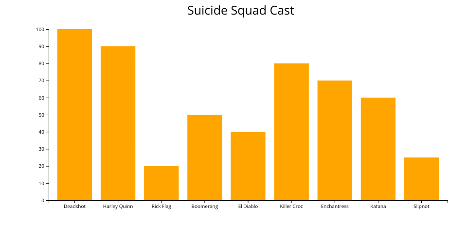 Suicide Squad cast graph witht their name and ranks. Data for the plot can be foud at https://github.com/colorfest/d3js/tree/master/data