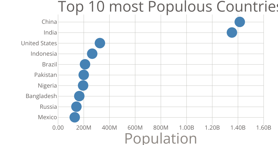 This bar chart shows population of the 10 most populous countries. The data comes ffrom the year 2018 in United Nations: World Population Prospects 2017.