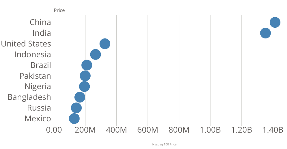 This bar chart shows population of the top 10 most populous countries. The data comes from the year 2018 estimate in United Nations: World Population Prospects 2017. It also demonstrates customization of D3 axes.