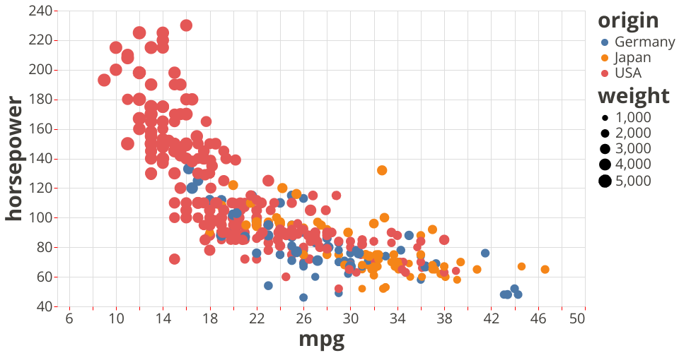 The data shown here comes from the UCI Machine Learning Repository: Auto MPG Data Set, via Gist: Scatter Plot with Menus.