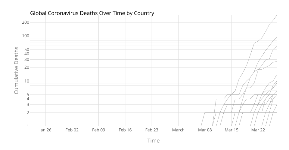 Line chart of Coronavirus cases to date, by country. Data from Johns Hopkins Coronavirus Dataset.
