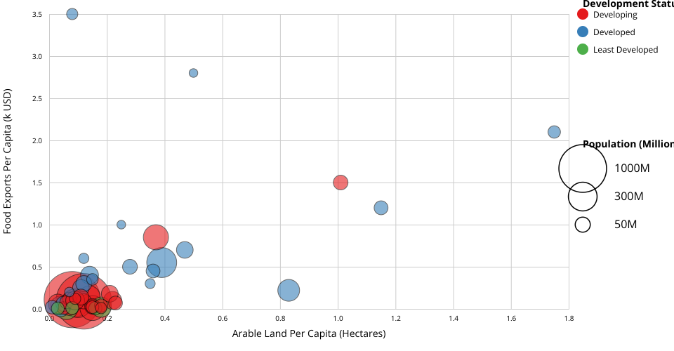 Dataset explantion:The dataset is basically an Global Agricultural and Economic Metrics file, which has data from almost more than 50 countries. It helps us to analyze the kind off relationship between a country's agricultural resource base and its economic output in the food sector.It has Key variables which include Arable Land per Capita, showing available farmland per person, and Food Exports per Capita, showing economic performance. For this chart, Population will be used to determine the size of the bubble, and Economic Development Status - Developed, Developing, Least Developed - will be used to categorize and color the data points. Chart Analysis: The bubble chart allows easy identification of a strong cluster of large Developing nations, in blue/green, grouped into the bottom-left quadrant.So from this, it can basically concluded that the countries with the highest populations for example such as China and India, has the lowest Arable Land per Capita and the lowest Food Exports per Capita. The Developed nations, in red, stretch along the upper-mid range, generally reaching much higher values in both metrics. This visualization nicely illustrates the pressure population puts on agricultural resources and how smaller, Developed economies often achieve superior export performance.