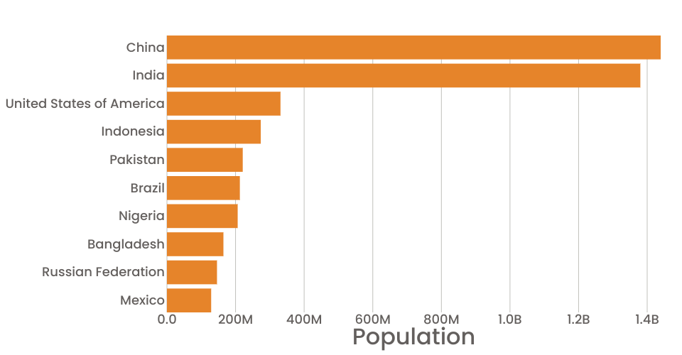 A program that shows the top 10 most populous countries as a pathetic bar chart with no axes.