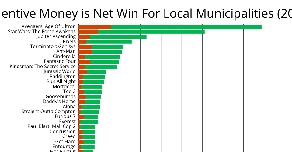 This bar chart shows the relationship between money spent by local municipalities to attract Hollywood productions to film there, and the resulting production costs spent in those local municipalities. For example, Georgia spent around $80 million dollars to Disney/Marvel so they would film "Avengers: Age of Ultron" in Georgia. Consequently, the production spent $445 million in Georgia to film. That money presumably went to local production crews, rental houses, catering, etc. though the municipality (Georgia) may retrieve some of that spending back in sales tax to local vendors, the net benefit is the infusion of Californian cash into the pockets Georgia locals. In theory. This demonstrates how effective non-Californian movie incentives are at moving "Hollywood" out of California.