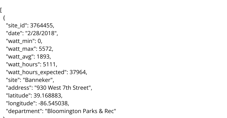 Solar data for power generation collected from a few sources, namely an array of solar panels at Bloomington Parks & Rec