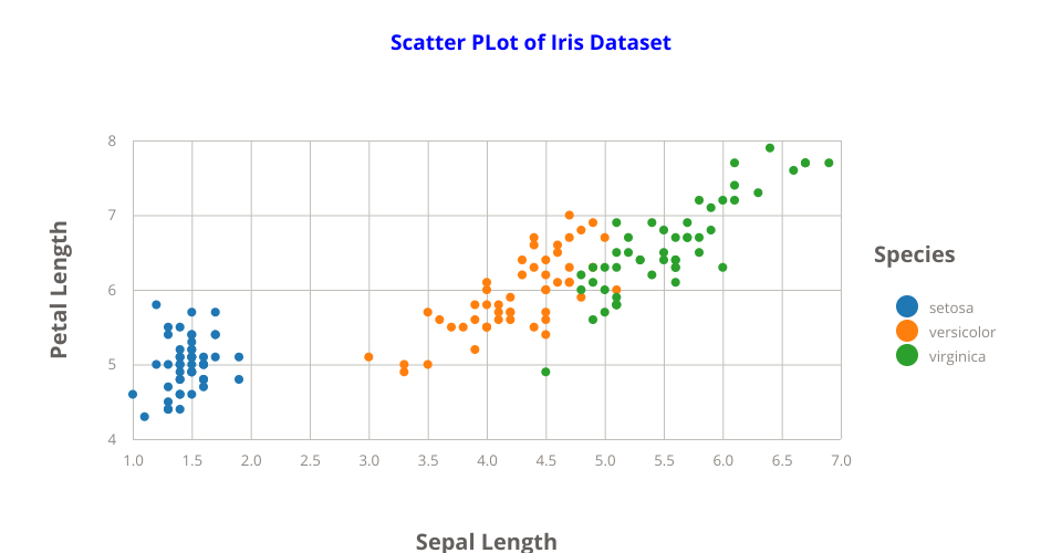 This visualization shows The Iris Dataset. It's designed to emphasize clustering by Petal Length and Sepal Length by Species.