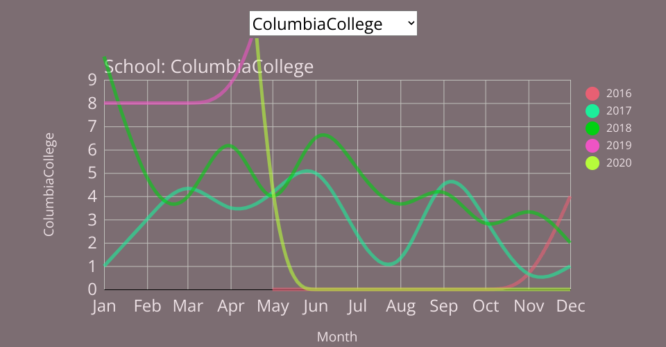 Data in this scatter plot is monthly per School disbursements from The Food Pantry at Columbia. The data is from May 2016 through April 2020, and will be updated monthly to show continued usage.