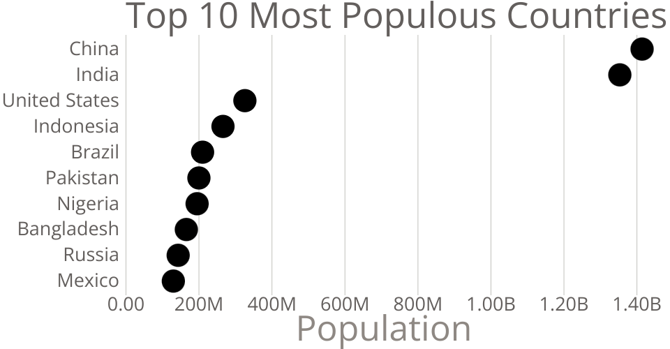 This bar chart shows population of the top 10 most populous countries. The data comes from the year 2018 estimate in United Nations: World Population Prospects 2017. It also demonstrates customization of D3 axes.