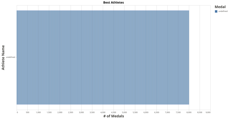 This bar chart shows the top athletes and their medals. It's designed to emphasize the top athletes in olympic games which data is collected by olympic data. Each bar references an athlete.This is an interactive bar chart. When your mouse is pointed at the athlete's bar, it will display the athlete's name, the year of the medal and the event in which the medal was awarded.