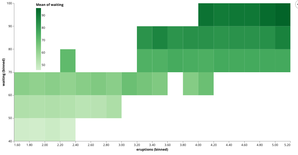 A visualization of the Old Faithful Dataset as a 2D HeatMap visualization using Vega-Lite.