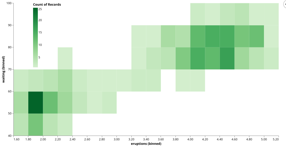A visualization of the Old Faithful Dataset as a 2D HeatMap visualization using Vega-Lite.