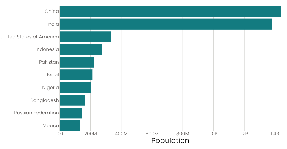 A program that shows the top 10 most populous countries as a pathetic bar chart with no axes.