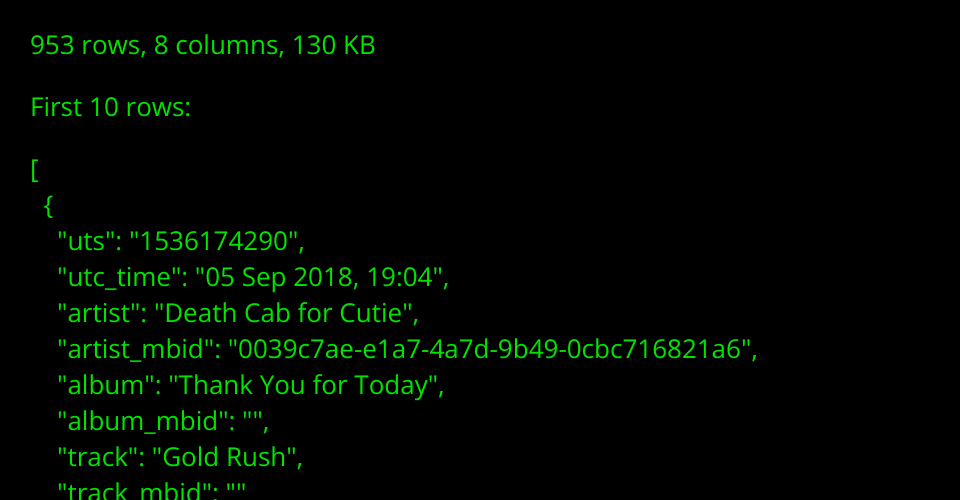 The data includes the Unix and traditional timestamp for when I listened to the track, as well as the artist/album/track information. Sometimes the data also includes MusicBrainz IDs for the artist/album/track. If I were to use this dataset going forward, I would like to add certain other information (specifically, genre or "mood") to the dataset somehow. This data also only includes from early August, because larger datasets weren't saving properly in VizHub.