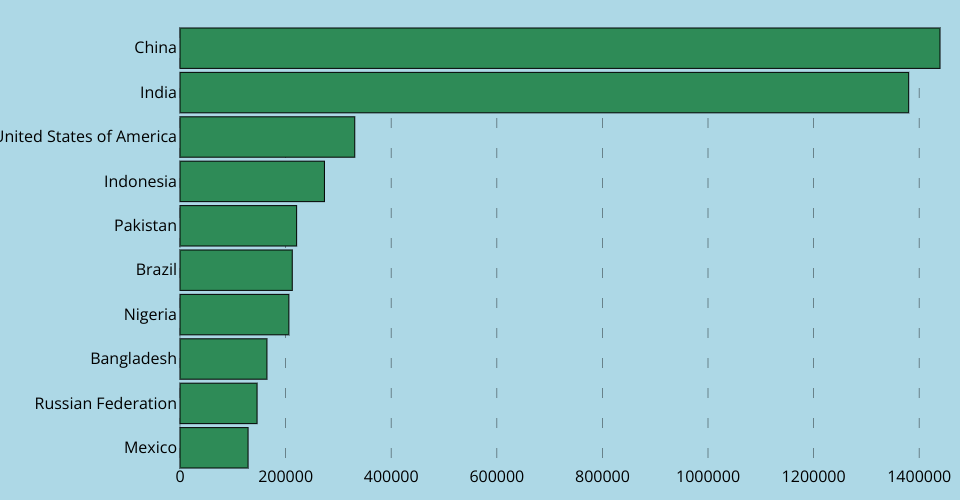 A program that shows the top 10 most populous countries as a pathetic bar chart with no axes.