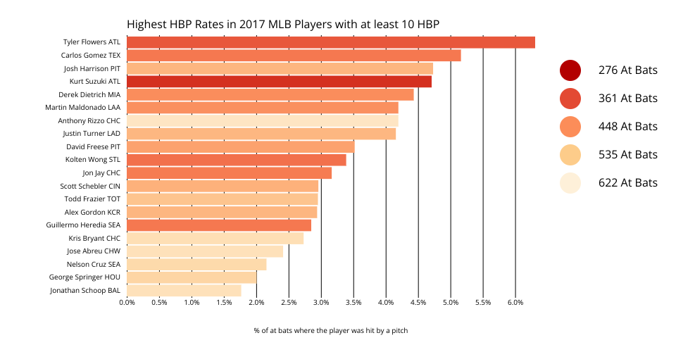 This bar chart shows the percentages of at bats during the 2017 MLB season that ended in a hit by pitch